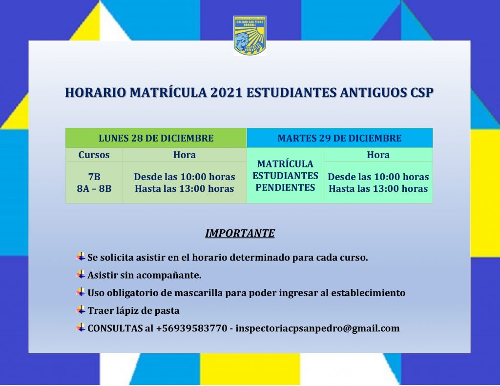 Lista de espera Matrícula 2021 Publicada el 25/12/2020Actualizado el 25/12/2020por Colegio San PedroCategorías:Información Información relevante sobre el funcionamiento de la lista de espera y horarios de atención, días 28 y 29.